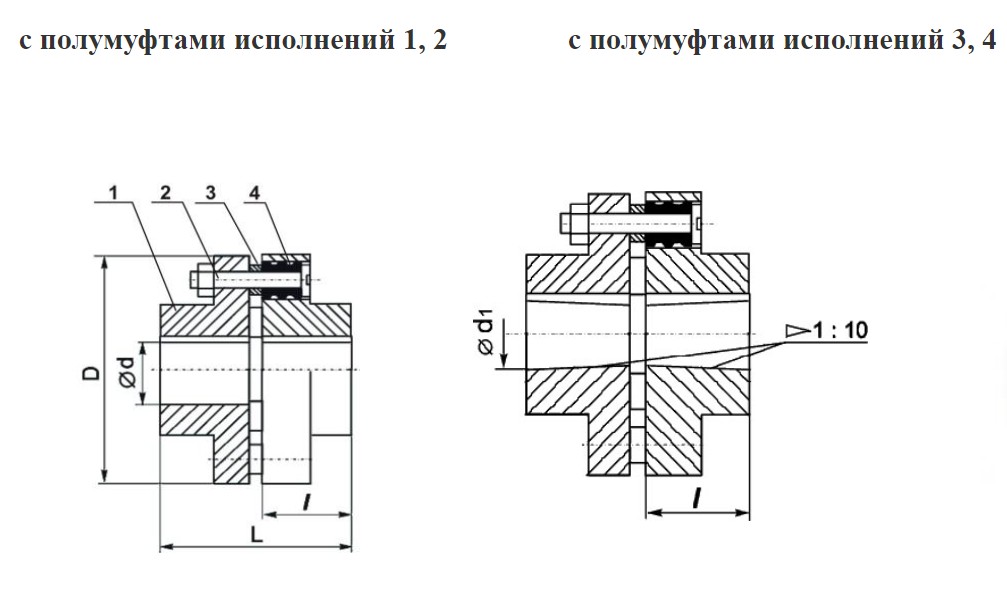 1 — полумуфта; 2 — палец; 3 — втулка распорная; 4 — втулка упругая.