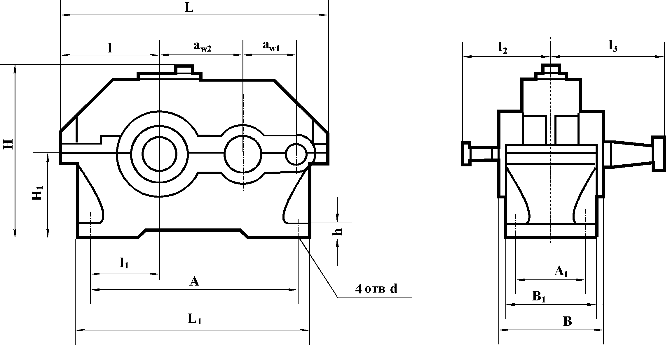 | Тип | аw2 | aw1 | L | L1 | 1 | 11 | l2 | l3 | Н | H1 | A | A1 | d | B | B1 | h | |